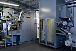 Mittlere Stückzahlen werden auf einer komplett CNC gesteuerten 1 Farben Zylinder - Rollensiebdruckmaschine MP1, mit einer Bahnbreite von 350 mm gedruckt.